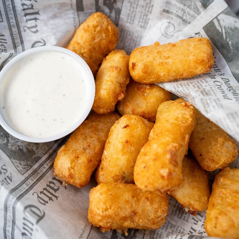 Macaroni mixed with a creamy pepper jack cheese that has been coated with a crispy garlic batter.